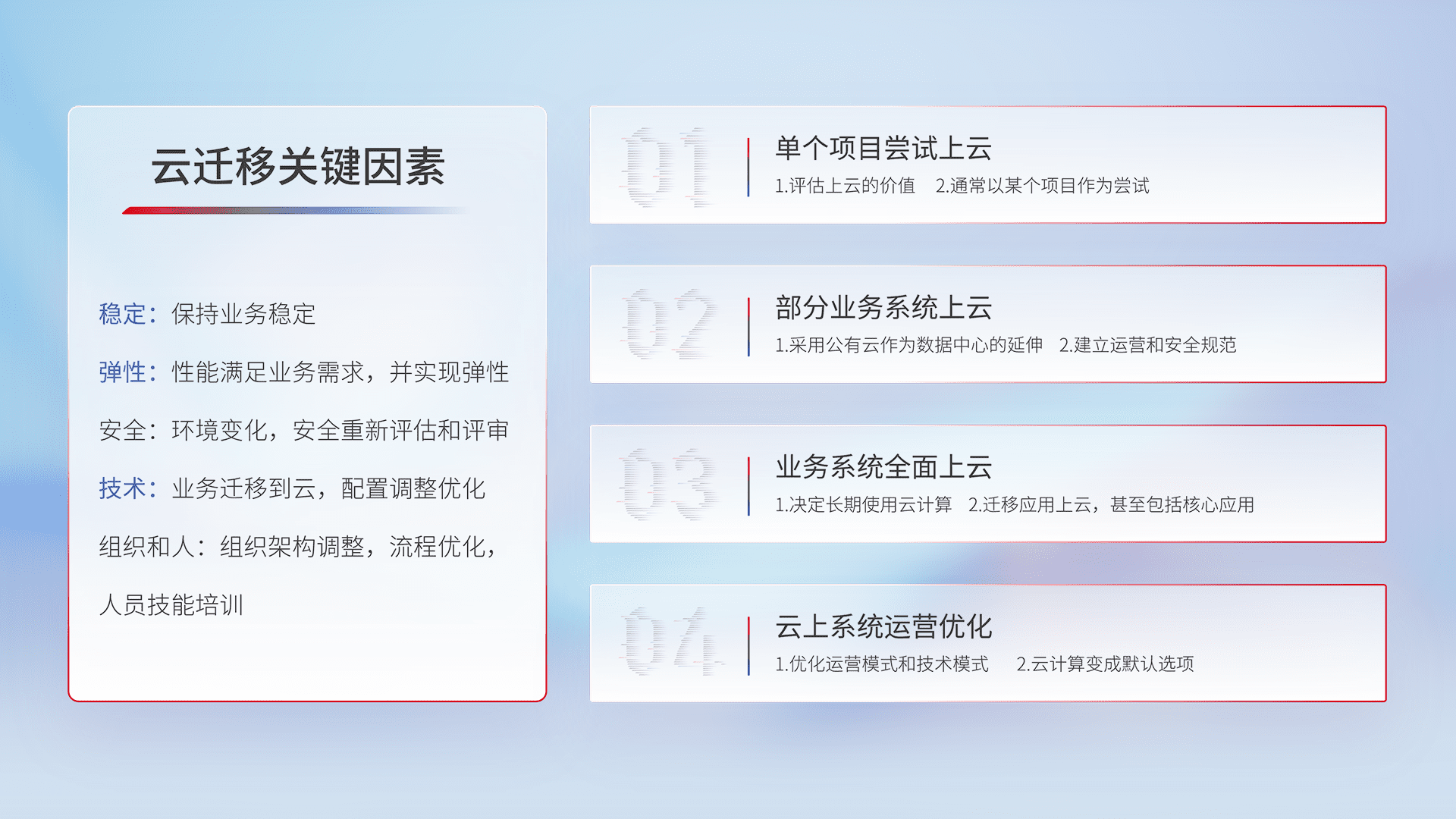 结合实际业务,,,从规划设计、、、云平台选型、、、、云原生改造、、、数据迁移、、集成交付,,,,迁移全过程为客户识别最佳上云路径,,,,做好风险识别管理,,,,设计网络架构、、、、身份权限、、安全审计合规、、操作审计、、、日志审计、、、监控告警策略、、、、多站点容灾设计等,,,对云上基础设施进行整体规划,,,,提升IT治理水平,,,以满足弹性、、高可用、、、、高性能的需求。。。