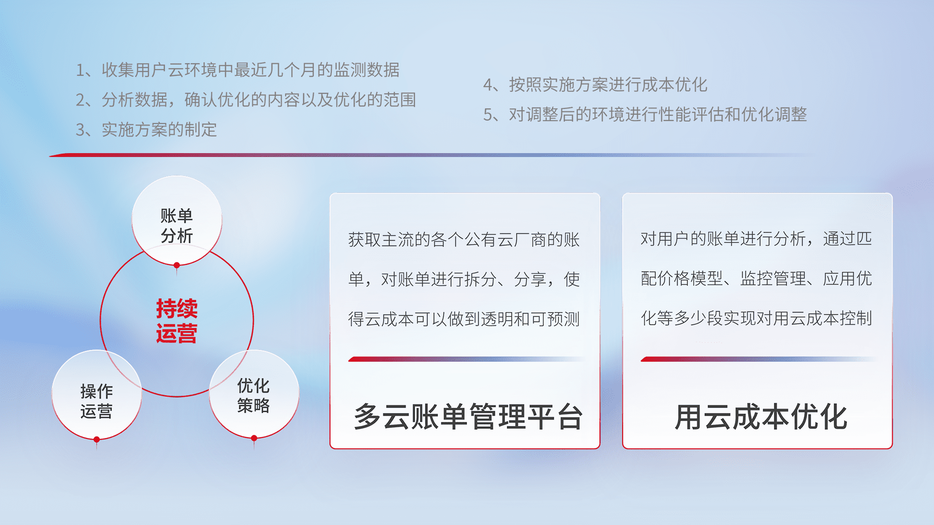 通过多云纳管,,以统一的资源数据模型把客户的云资源进行抽象和封装,,,进而实现对多云资源的统一操作,,,,保障云资源管理的可靠性、、稳定性与可用性。。。。量身定制化运维内容,,,配置、、开发运维、、补丁管理、、、备份、、监控、、、认证和访问管理、、、、审计和日常巡检等,,,保障在用云过程中的可靠度,,,,稳定度以及高可用率。。